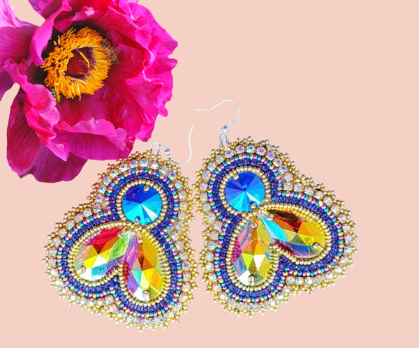 Beaded on stiffined felt with a stunning gem , faux leather backings and sterling silver plated earrings hooks also made in silver plated clip ons for those who chose not to pierce.